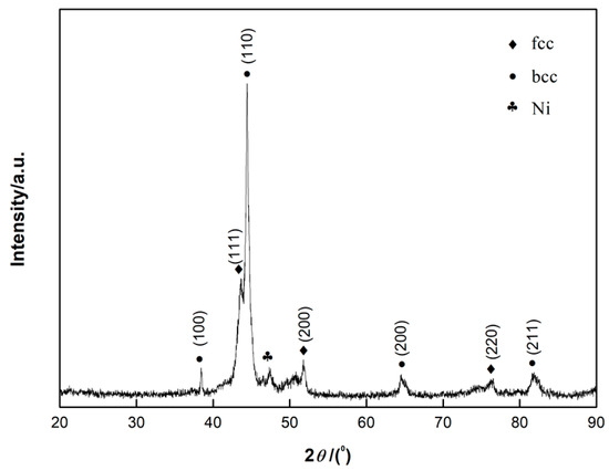The XRD patterns of the specimens of AlCoCrFeNiTi0.5 HEA are shown in Figure 2; it can be inferred that the main components are FCC and BCC phases. The diffraction peaks of the FCC phase are crystal face (111), (200), and (220) with a structure of [Fe, Ni] solid solution. The lattice constant of FCC is 0.35807 nm, and the spatial group belongs to the Fm-3m (225) spatial structure. The diffraction peaks of BCC phase are crystal face (100), (110), (200), and (211) with a structure of [Fe, Cr] solid solution. The lattice constant of FCC is 0.28719 nm, and the spatial group belongs to the Im-3m (229) spatial structure. The microstructure of AlCoCrFeNiTi0.5 HEA is detected by OM, as shown in Figure 3, where there are two phases, which should belong to the BCC and FCC phase according to the result in Figure 2.