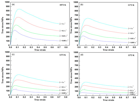 Flow stress–strain curve of AlCoCrFeNiTi0.5 HEA under different conditions: (a) 1073 K, (b) 1173 K, (c) 1273 K, (d) 1373 K.