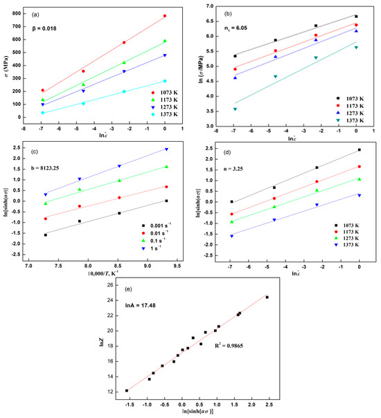 where Q is activation energy (kJ∙mol−1), R is the universal gas constant (8.314 J∙mol−1∙K−1), σ is flow stress (MPa), is strain rate (s−1), T is deformation temperature (K), A1, A2 and A3 are material constants, n and n1 are stress exponents, and α is stress factor (α = β/n1, MPa−1). It should be noticed that Equation (3) is suitable for any condition.