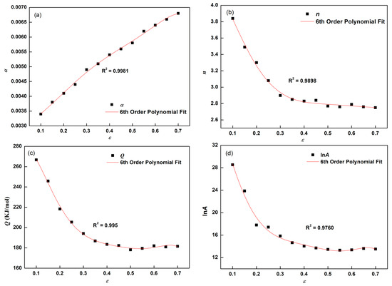 It has been reported that the rheological characteristics of an alloy can be described by the relationship between strain and material constant. The values of α, n, Q and lnA under different deformation conditions are shown in Table 3. The material constant is represented as a polynomial function of the strain, which can more accurately reflect the relationship between the material constant and the strain, and the corresponding results are shown in Figure 6. The correlation coefficient is higher than 0.9760, which indicates that the fitting effect is good. The relationship between stress and material constant can be obtained by combining Equations (3) and (4). Combining the calculated material constants with strain polynomial fitting results, the constitutive equation of AlCoCrFeNiTi0.5 can be expressed as follows.