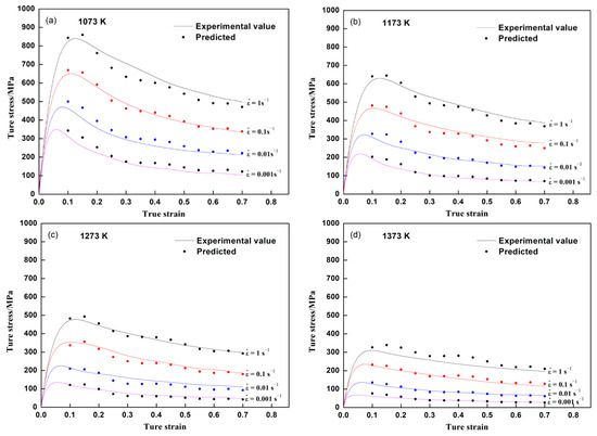 Comparison between experimental and theoretical values of stress under different deformation conditions: (a) 1073 K, (b) 1173 K, (c) 1273 K, (d) 1373 K.