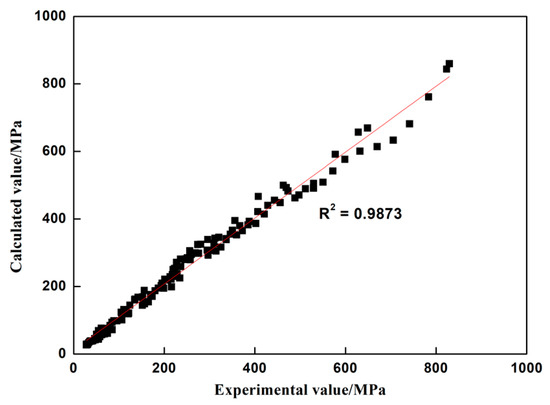 In order to verify the accuracy of the constitutive equation, the stress of AlCoCrFeNiTi0.5 HEA under different strain rates is calculated according to Equation (10); the corresponding results are shown in Figure 7. It can be concluded that the theoretical calculation values and experimental values are highly consistent when the strain rate is 0.001 s−1, 0.01 s−1 and 0.1 s−1. However, there is a significant deviation between the theoretical calculation value and the experimental value when the strain rate is 1 s−1 at 1073 K and 1373 K. Figure 8 shows the comparison between the theoretical and experimental values of flow stress. The slope of the curve is 0.9757, and the correlation coefficient is 0.9873, which indicates that the constitutive equation can accurately predict the flow stress of AlCoCrFeNiTi0.5 HEA.