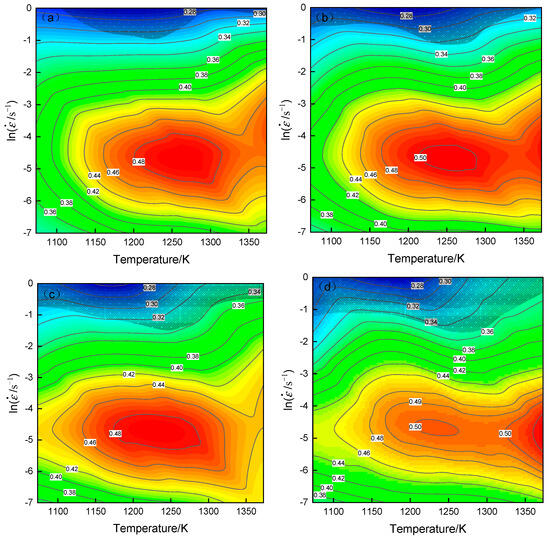 Processing map of AlCoCrFeNiTi0.5 HEA with strain at (a) 0.3, (b) 0.4, (c) 0.5 and (d) 0.6.
