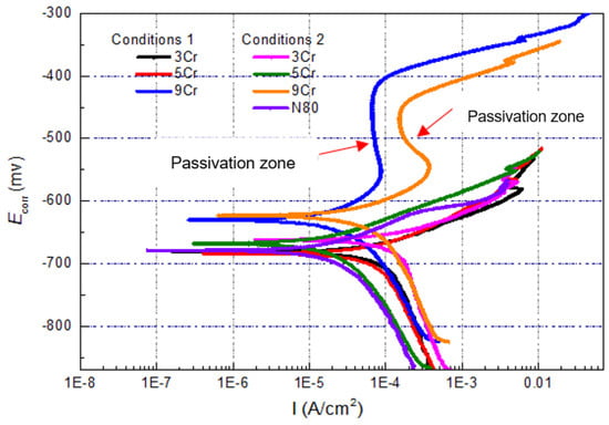 Figure 4 illustrates the polarization curves of 3Cr, 5Cr, and 9 Cr materials at different CO2 concentrations and 80 °C, including a 50% CO2 aqueous solution (Condition 1) and a saturated CO2 aqueous solution (Condition 2). It can be observed from the polarization curve in Figure 4 that the self-corrosion potential of the material containing 9% chromium is relatively high under both concentrations of CO2, indicating a weak thermodynamic tendency for corrosion in the test environment []. At the same time, the anode curve has obvious passivation zone, and the passivation current density remains unchanged or decreases, which shows that it is easy for the surface of the material to be deactivated and the film hinders the further corrosion of the material. However, when the anodic polarization potential increases continuously and reaches the pitting corrosion explosion potential, the passivation film breaks down, resulting in a sudden increase in corrosion current density (Icorr) and subsequent pitting corrosion. Comparing the polarization curves and curve indicators of three Cr-containing materials under Condition 2 (Table 3), it can be seen that the self-corrosion potential of the materials under Condition 2 has a slight upward trend, which indicates that the surface passivation film is easy to form under this environment, so that the thermodynamic kinetic energy of the materials increases, thus weakening the corrosion trend. At the same time, the curve slightly shifts to the right and the corrosion current density increases relatively. From the dynamic analysis, once corrosion occurs, the corrosion rate is relatively large, and the self-corrosion potentials of 3Cr and 5Cr materials in the two CO2 environments are similar to those of N80, which indicates that the corrosion resistance of these two materials containing low Cr is similar to that of carbon steel N80. Compared with the chemical compositions of the materials, the Cr content only increases by 2%–4%, not enough to obviously improve the corrosion resistance of the materials in this simulated test environment.