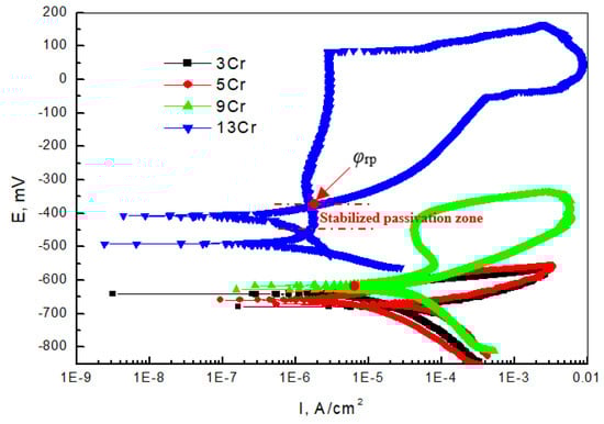 Figure 5 shows the cyclic anodic polarization curve of Cr-containing materials in a simulated oilfield environment in which 13Cr, with a relatively high Cr content, is used as the contrast material. The cyclic polarization curve can judge the local corrosion tendency of materials by encapsulating the hysteresis envelope area. It can be seen from the test results that there is an intersection point φrp (protection potential) between the forward and reverse polarization curves of 13Cr, and there is a stable passivation zone below φrp, where the pitting corrosion formed will stop developing and turn into a passivation state. It can be seen from the cyclic anodic polarization curve of the 9Cr material that the intersection point of the forward and reverse polarization curves is not in the anodic passivation zone (red circle), which indicates that although the surface passivation occurs, the passivation state is unstable, and the initial pitting corrosion continues to expand, indicating that the pitting corrosion sensitivity is high [,]. Under the same conditions, 3Cr and 5Cr have no passivation behavior. From a comparison of the cyclic anodic polarization curves of four Cr-containing materials, it can be seen that when the content of Cr is at least 13%, it is easy for a stable passivation zone to form on the surfaces of the materials and the pitting corrosion has a self-repairing effect to slow down the further expansion of local corrosion.