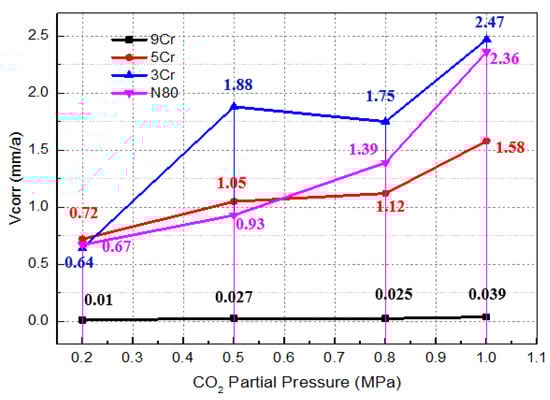 Figure 6 shows the average corrosion rates of the materials under different test conditions, obtained by using the weight loss method after the high temperature and high pressure simulation test. It can be seen that the average corrosion rates of different Cr-containing materials are obviously different. With the gradual increase in CO2 partial pressure, the average corrosion rates of the three materials all increase by different degrees. Among them, the corrosion rates of 9Cr materials are relatively the smallest under different CO2 partial pressures, and when PCO2 is less than 1MPa, the average corrosion rates of 9Cr materials do not increase obviously and the corrosion that occurs is mild corrosion. While PCO2 = 1 MPa, the corrosion is moderate corrosion; however, the average corrosion rates of 3Cr and 5Cr materials increase obviously, and both reach the extremely serious corrosion degree []. At the same time, it can be seen that the corrosion degree of carbon steel N80 is almost the same as that of 3Cr and 5Cr under the same test conditions, which shows that the corrosion resistance of 3Cr and 5Cr materials is not obviously different from that of carbon steel N80 under the simulated test conditions. Thus, the corrosion resistance of materials cannot be effectively improved when the contents of alloying element Cr are 3% and 5%.