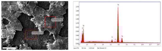 The EDS energy spectrum of the corrosion product film under different test conditions was quantitatively measured by using an energy spectrometer and the local film shedding area and Cr element enrichment on the surfaces were comparatively analyzed. The schematic diagram of EDS energy spectrum detection points is shown in Figure 11, and the test results of the element compositions of the corrosion product film under different conditions are shown in Table 5. It can be seen that the element compositions of the corrosion product film are basically similar; it is mainly composed of the Cr, O, and Fe elements. The corrosion products can be inferred as Cr(OH)3, FeCO3, and Cr2O3 []. Comparing the Cr content in the product films in Table 5, it can be seen that the Cr content in the corrosion films of 3Cr and 5Cr materials is at least three times that in the substrate. With an increase in the CO2 partial pressure, the Cr content in the product films is as high as six times that of the substrate, indicating an aggravation of the corrosion degree and a strengthened Cr enrichment in the corrosion product films. However, the Cr content in the product film of the 9Cr material is about 1.5 times that of the substrate, which indicates that the product film is relatively thin. Therefore, combined with the comprehensive analysis of the corrosion rate, corrosion morphology, and Cr enrichment content in the product film, although Cr is the alloy element, it is comprehensively analyzed that the Cr enrichment on the surfaces of 3Cr and 5Cr materials is higher and the corrosion film is thicker. However, the cracking and shedding of the film do not hinder or alleviate the further corrosion of the materials. The relative enrichment ratio of the 9Cr product film is relatively low, and the corrosion product film is relatively thin, but the film is flat and compact, which alleviates the further corrosion of the material. Thus, the material has relatively good corrosion resistance. It can be seen from the energy spectrum of the shedding area of the product film that it is mainly composed of the Cr, O, and Fe elements. Hence, the bare surface of the sample is corroded again to form a secondary product film.