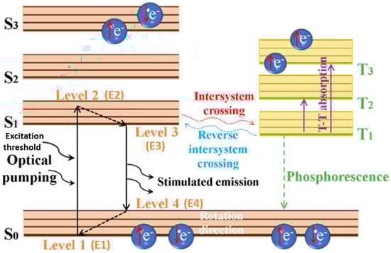 In organic semiconductor laser devices, there are parasitic effects on the laser emission wavelength, mainly from the absorption in the triplet state, which affect the laser emission and can raise the excitation threshold or even completely stop the laser emission [20,21]. When the organic gain medium is in the excited state S1 under the stimulation of the pumping source, it tends to relax back to the ground state S0. However, there is also a small possibility of accessing the first triplet state T1 through intersystem crossing. Although the emission intensity of the triplet exciton in the system is very weak, its lifetime is usually very long because its spin is prohibited from returning to the S0 ground state. As a result, the energy is only released in the form of heat slowly instead of rapid excitation emission. Furthermore, the organic material may also change its spin direction through the intersystem channel or heat release, transitioning to the higher excited state Tn by energy absorption and annihilation. In this process, the absorption spectrum of the excited state tends to overlap with the emission spectrum of organic materials, greatly increasing the modal loss and raising the threshold accordingly. Even the triplet excitons accumulate over time and result in the laser device being able to run for only a few nanoseconds [10,22]. This adversely affects the continuous operation of organic lasers. Therefore, suppressing the triplet excitons to diminish the threshold and guarantee continuous operation of the device is of great importance.