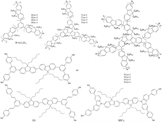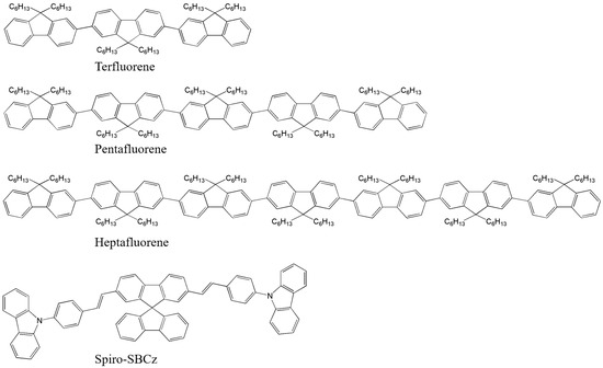 Organic small-molecule semiconductors are commonly used as organic materials to develop organic light-emitting diodes (OLEDs). They have small molecular weights, and most films are prepared through hot evaporation. The π-π stacking among small organic molecules and the dipole interactions among their units eventually lead to intrinsic fluorescence quenching. This reduction in modal gain increases the excitation threshold. Scholars have tried various methods in molecular design to improve the optical emission performance of thin films. Some of these methods include constructing a D-π-A structure using branch chain functions and strictly spatial requirement substitution to reduce the quenching effect of organic small molecular gain medium and to minimize the adverse effect of intermolecular π-π stacking on organic lasers [38,39,40]. Fluorene is a common fluorescent structural group that can easily form functional groups and solubilized groups through cross-coupling reactions. This allows the production of various molecules based on fluorene (Figure 7). Choi et al. [41] studied the photophysical properties and ASE properties of a series of oligomer fluorene treated with monodisperse solutions, functionalized by a hexyl chain at the C9 position of different fluorene units. The fluorene positions functionally developed linear oligomer fluorene of hexyl chains, and an ASE threshold of 0.4 μJ·cm−2 was obtained in a nitrogen environment.