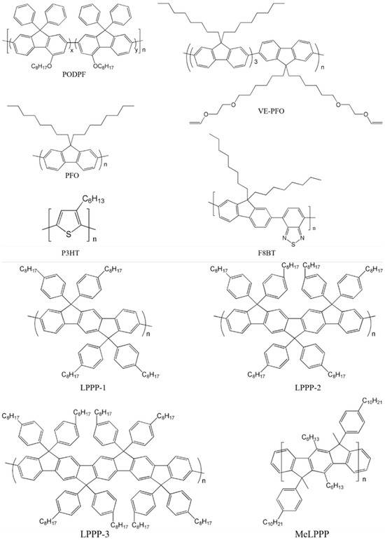 Molecular structures of PODPF, PFO, VE-PFO, P3HT, F8BT, LPPP-1, LPPP-2, LPPP-3, MeLPPP.