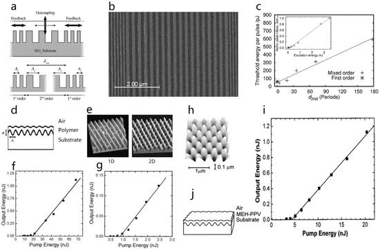 - Wallikewitz, B.H.; Nikiforov, G.O.; Sirringhaus, H.; Friend, R.H. A nanoimprinted, optically tuneable organic laser. Appl. Phys. Lett. 2012, 100, 173301. [Google Scholar] [CrossRef]