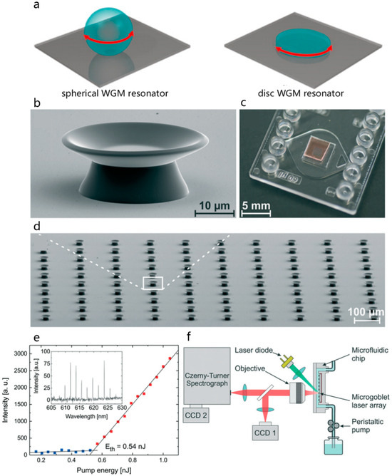 - Wienhold, T.; Kraemmer, S.; Wondimu, S.F.; Siegle, T.; Bog, U.; Weinzierl, U.; Schmidt, S.; Becker, H.; Kalt, H.; Mappes, T.; et al. All-polymer photonic sensing platform based on whispering-gallery mode microgoblet lasers. Lab Chip 2015, 15, 3800–3806. [Google Scholar] [CrossRef]