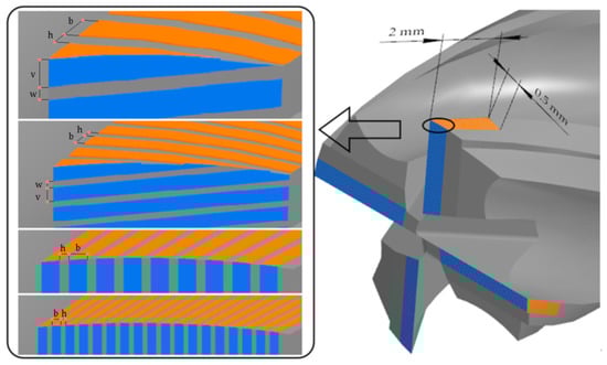 Laser processing schemes h = 20–50 µm, b = 80–200 µm («orange»—the back surface of the cutting edge; «blue»—the back surface of the end cutting edge.