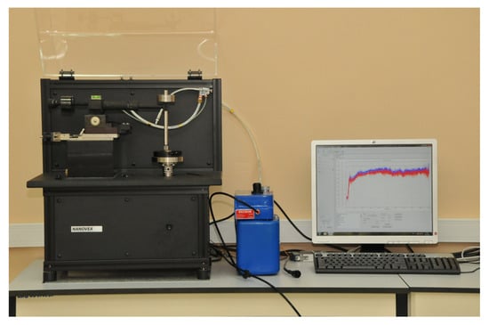 At the preliminary stage, to reduce the number of full-scale experimental studies on milling, as well as to optimize the technology and modes of laser processing, a series of tests were conducted on two functionally different types of tribometer: to assess the adhesion of the coating with the substrate of the tool material; to assess the application technology and the influence of «coating,» «coating + laser treatment» and simply «laser treatment» on the tribotechnical characteristics were conducted a series of experimental studies. Tribotechnical characteristics of coatings and technologies of their application were evaluated on two types of equipment: high-temperature tribometer «Nanovea» TRB (Figure 3) and adhesion unit [13] (adhesionomer) with a circuit diagram (Figure 4).