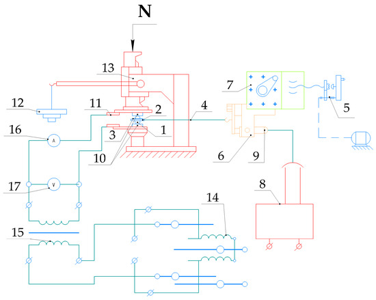 Principle scheme of the installation for adhesion research. 1—indenter; 2—rotating disk; 3—insulator; 4—cable for rotation; 5—rotation drive; 6—elastic element; 7—skid; 8—recorder; 9—sensor; 10—samples; 11—copper plates with current collector; 12—set of weights; 13—mechanical press; 14—current regulator; 15—transformer; 16—ammeter; 17—voltmeter.