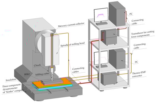 A considerable number of works [28,29] have been devoted to studies of temperature and methods of its measurement during metal cutting, in which it is shown that to obtain information about the average contact temperature during cutting with sufficiently high accuracy, simplicity, and reliability, it is possible to use the method of a natural thermocouple. In the research, this method was used to determine the average cutting temperature. In this case, the workpiece and the cutter were isolated from each other to exclude errors from the so-called «parasitic» thermo-EMF. The thermal EMF was measured in the interval of 10–15 s after the beginning of milling. A mercury current collector, a digital voltmeter «Elemer», and a PC were used to record and record the value of thermal EMF. The schematic diagram of temperature studies during milling is shown in Figure 8.