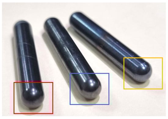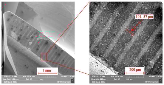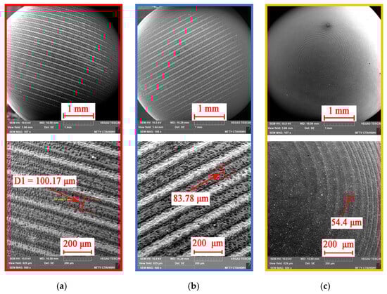 For tribotechnical tests on the Nanovea TRB tribometer and high-temperature adhesion unit, indenters were manufactured, and innovative wear-resistant coatings were applied with subsequent laser treatment (texturing), shown in Figure 9. The specimens were studied using a Tescan Vega 3 LMH scanning electron microscope (SEM, Tescan, Brno, Czech Republic) equipped with an X-Act energy dispersive analysis (EDX) module (Oxford Instruments, Abingdon, UK). Images were obtained at the accelerating voltage of 10 kV using a secondary electron detector (SE) and a backscattered electron detector (BSE). For this purpose, an archetype of laser processing (texturing) was developed in the form of longitudinal parallel lines (a,b) and concentric circular lines (c) with optimization of their pitch and width of the laser beam (Figure 10).