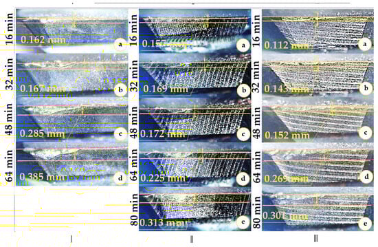 I-untextured, II-perpendicular, III-parallel. Wear kinetics on the rear surface: (a) longitudinal texture on the end top of the cutter (p = 10 W; b = 0.75 mm); (b) back surface longitudinal texture of the cutting edge (p = 20 W; b = 0.3 mm); (c) back surface longitudinal texture of the cutting edge (p = 20 W; b = 0.285 mm); (d) longitudinal texture of the back surface of the end cutting edge (p = 20 W; b = 0.3 mm); (e) back surface longitudinal texture of the cutting edge (p = 20 W; b = 0.633 mm).
