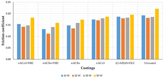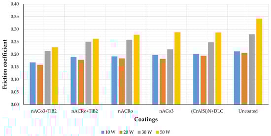 Influence of coating and laser processing power on friction coefficient of «EP99-H10F» pair with layers after laser processing at different strengths (at p = 1 MPa; ϴ = 700 °C).