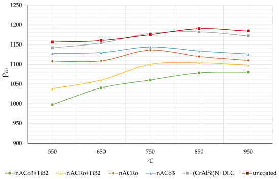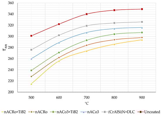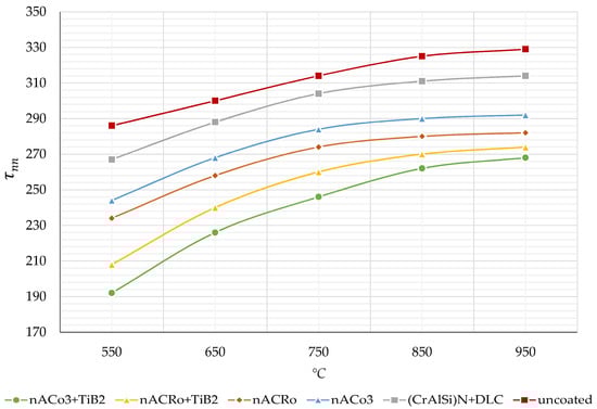 The analysis of the obtained experimental data showed that the lowest coefficient of friction under these test conditions is provided by the following coatings for the pair «EP99—H10F», respectively: nACo3+TiB2 (friction coefficient by 21% less compared to nACRo+TiB2); nACRo+TiB2 and nACRo, for the pair «EK61-H10F», respectively: nACRo+TiB2 (friction coefficient by 25% less compared to nACRo); nACRo; nACo3+TiB2. Based on the above, further experimental studies and laser processing of the tool material with different wear-resistant coatings were carried out at a power value equal to 20 W. Figure 15, Figure 16, Figure 17, Figure 18, Figure 19 and Figure 20 show the results of adhesion studies—the dependence of the adhesion component of the coefficient of friction on the contact temperature for different coatings. Analysis of the obtained experimental data showed that for all the studied coatings after laser treatment with increasing temperature, the adhesion component of the friction coefficient monotonically increases and has a minimum value similar to the tests on the high-temperature tribometer «Nanovea TRB», i.e., the best performance on tribotechnical parameters. i.e., the best indicators on tribotechnical characteristics correspond at temperature 650 ºC: for pair «EP99-H10F»—nACo3+TiB2 with a decrease on the average of 11% and for pair «EK61-H10F»—nACRo+TiB2 with a decrease of the average on 8%.