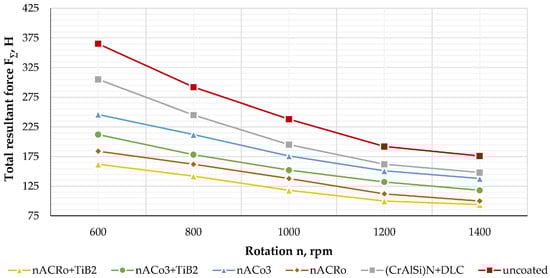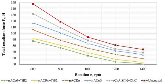 Effect of tool speed during EK61 milling on the tangential component of cutting force after laser machining different coatings.
