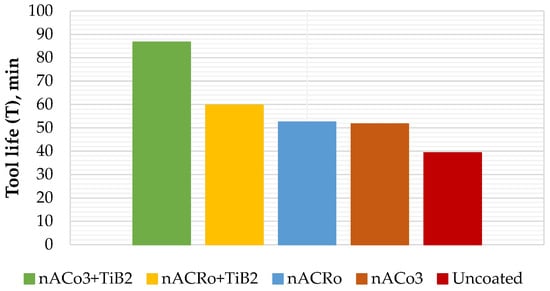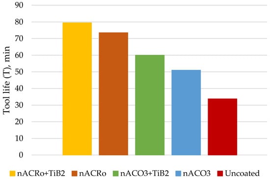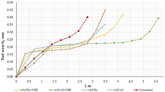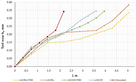For comparative analysis of the obtained results of wear-resistance tests, the following were plotted: dependences of the effect of the cutting path length (l, m) on the wear on the rear surface (hr, mm); dependences of the durability period (T, min) on the applied wear-resistant coating at the corresponding blunting criterion—, as well as dependencies of the critical cutting path length (lcr, m) on the applied wear-resistant coating. At the same time, the durability period (T, min) was determined as the ratio of the critical length of the cutting path (lcr, m) to the cutting speed (V, m/min) or as follows: