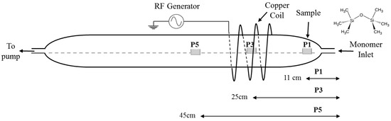 Prior to each plasma deposition, the reactor was cleaned for at least 30 min using a high-power air plasma treatment (Pg = 65 W) to ensure the elimination of residues in the reactor. The substrates were then introduced into the chamber by placing them on a glass support in the desired zone of the reactor. Three preferential positions were chosen for this study (Figure 1): P1 in the pre-discharge zone, P3 in the discharge zone located in the middle of the copper coil, and P5 in the post-discharge zone.