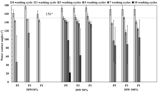 The resistance to washing of HMDSO plasma polymers deposited on cotton fabrics under different operating conditions was studied by subjecting the samples to repeated laundering cycles, also commonly named washing cycles, according to standard procedures used in the textile industry. The measurement of the static contact angle with water was chosen to evaluate the durability of the superhydrophobic properties of the coatings and was therefore performed on each sample after each washing cycle. Figure 2 summarizes the water contact angle values measured on HMDSO plasma polymers synthesized under different conditions (DC = 10%, 50% and 100%, positions: P1, P3 and P5) after different numbers of washing cycles (0, 1, 3, 5, 7 and 10 cycles). First, it should be noted that all coatings at least partially survived one washing cycle since water contact angles higher than 140° were measured on all samples after this first washing cycle. However, it should be noted that all samples have been slightly affected by this durability test since all water contact angles decrease from at least 10°. More significant differences in the wetting behavior of the HMDSO plasma polymers can be observed by increasing the number of washing cycles.