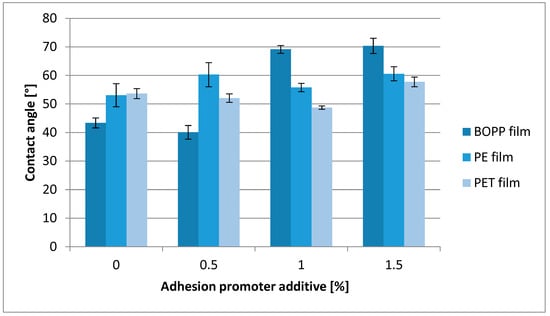 Effect of adhesion promoter additive in ink on contact angle of inks on different packaging films.
