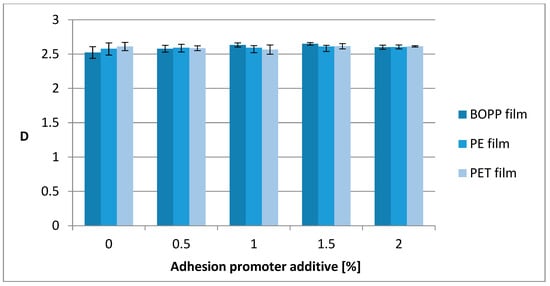 The optical density of the ink layer (D) is treated as a basic parameter for evaluating the quality of the print. All the prints made are characterized by very high values of D (Figure 2). As the statistical analysis showed, the values of D are significantly different for individual prints (F(14,210) = 1.739, p = 4.5 × 10−7), while for prints made on PET film, there were no significant differences in D values (F(4,70) = 2.503, p = 0.738). In contrast, the use of silane additive to inks had a significant effect on the optical density of prints on BOPP and PE film—(F(4,70) = 2.503, p = 7.74 × 10−9) and (F(4,70) = 2.502, p = 0.014), respectively. Post hoc comparisons using the Tukey–Kramer test showed statistically significant differences between the groups: PET0/BOPP1.5; PET0.5/BOPP0; PET1.0/BOPP0; PET1.5/BOPP0; PET2.0/BOPP0; BOPP0/BOPP1.0; BOPP0/BOPP1.5; BOPP0/BOPP2.0; BOPP0/PE0; BOPP0/PE1.5; BOPP0/PE2.0; BOPP0.5/BOPP1.5; BOPP1.0/PE1.0; BOPP1.5/PE0.5 and BOPP1.5/PE1.0. In other cases, the differences were not statistically significant. The higher D values for prints made with inks with the addition of 0.5%–1.5% adhesion promoter on BOPP and PE film may be due to a change in ink viscosity and a change in substrate wettability. At the same time, the effect of ink modification on print quality is closely related to the type of substrate and is the greatest on BOPP film. In conclusion, the addition of aminopropyltriethoxysilane to ink in the amount of 0.5%–1.5% has a favorable effect on the quality of printing on BOPP and PE film.