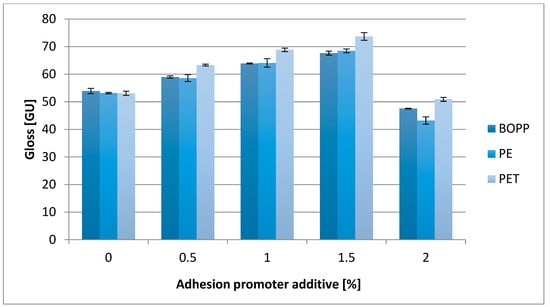 Effect of the addition of an adhesion promoter in ink on the gloss of prints made on different substrates (measurements made for a measurement geometry of 60°).