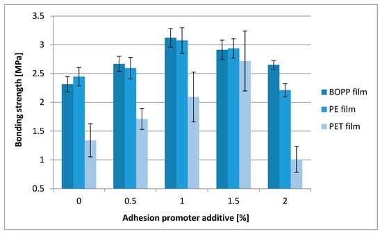 Often, the problem of obtaining adequate adhesion of ink to the substrate [32] is approached by using appropriate adhesion enhancers, i.e., adhesion promoters [31,33,34]. The way adhesion promoters work is partly by forming chemical bonds with the surface of the substrate and the binder and partly by increasing the wettability of the surface or forming a layer between the substrate and the binder [35]. Many adhesion promoters are available on the market: silanes, silicones, titanium compounds, zirconates, amides, imines, phosphates, and specially modified polymers [17,36]. Furthermore, there are binding agents, plasticizers, and additives (e.g., wetting agents) that are designed for other purposes but provide good adhesion as an additional effect. When it comes to adhesion forces, the total ink formulation is decisive in many cases. The right choice of resin is key [5,17,21], but so are the solvents. In the case of water-based inks, the amount of solvent is so small that the possibility of partial dissolution and/or swelling of the film surface is negligible, thereby achieving little improvement in adhesion through mechanical anchoring on the film; nevertheless, the addition of solvent will affect the SFE value, as well as may affect the bonding process of the ink components [35].