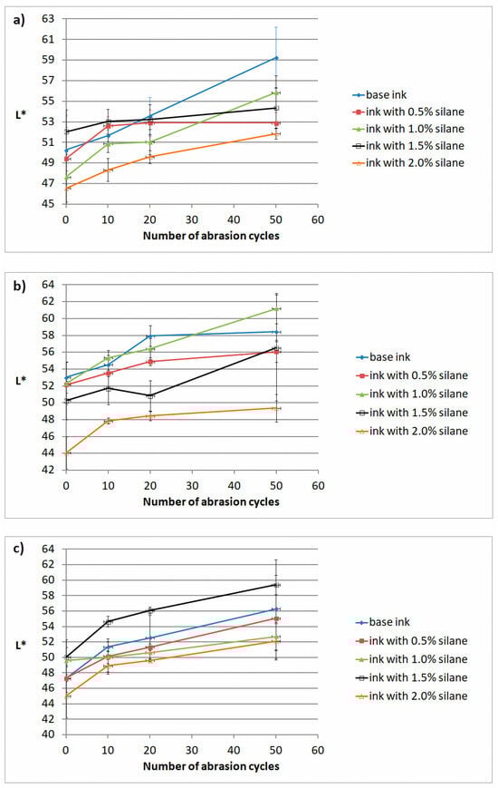 Another indirect method used to determine whether the adhesion values are correct is abrasion resistance testing. Test results for individual prints prepared on BOPP, PE, and PET film are shown in Figure 5a–c, respectively. Subjecting the prints to 10 abrasion cycles led to changes in their brightness (an increase in L* due to ink abrasion), which were even greater as the number of cycles increased to 50. The ANOVA test confirmed the presence of significant differences in the brightness of prints subjected to abrasion, (F(14,40) = 1.948, p = 2.15 × 10−13) and (F(14,40) = 1.948, p = 7.09 × 10−10), to 10 cycles as well as 50 cycles, respectively. Meanwhile, statistically significant differences were obtained for the following groups at attrition of 10 cycles: PET0/PET0.5; PET0/PET2.0; PET0/BOPP0-2.0; PET0/PE0.5; PET0.5/PET1.5; PET0.5/BOPP0-0.5; PET0.5/PE0; PET0.5/PE1.0-2.0; PET1.0/PET2.0; PET1.0/BOPP0-1.0; PET1.0/BOPP2.0; PET1.5/PET2.0; PET1.5/BOPP0-2.0; PET2.0/BOPP0; PET2.0/PE0-2.0; BOPP0/BOPP0-2.0; BOPP0/PE0-2.0; BOPP0.5/BOPP1.5; BOPP0.5/PE0-2.0; BOPP1.0/PE0; BOPP1.0/PE1.0-2.0; BOPP1.5/PE0; BOPP1.5/PE1.0-2.0; BOPP2.0/PE0; BOPP2.0/PE1.0-2.0; PE0.5/PE1.0. On the other hand, at attrition of 50 cycles, the groups were: PET0/PET1.0-2.0; PET0/BOPP0.5-2.0; PET0/PE0-2.0; PET0.5/PET1.0-2.0; PET0.5/BOPP0.5-2.0; PET0.5/PE0; PET0.5/PE1.0-2.0; PET1.0/BOPP0; PET1.0/BOPP2.0; PET1.0/PE1.0; PET1.5/BOPP0; PET1.5/BOPP2.0; PET1.5/PE1.0; PET2.0/BOPP0; PET2.0/BOPP2.0; BOPP0/BOPP0.5-2.0; BOPP0/PE0-2.0; BOPP0.5/BOPP2.0; BOPP0.5/PE1.0; BOPP1.0/BOPP2.0; BOPP1.0/PE0.5; BOPP1.5/BOPP2.0; BOPP1.5/PE1.0; BOPP2.0/PE0-0.5; BOPP2.0/PE1.5-2.0; PE0/PE0.5; PE0.5/PE1.0; PE1.0/PE1.5. The results obtained allow us to conclude that the addition of aminopropyltriethoxysilane has a favorable effect on abrasion resistance, where the amount of additive most favorably improving resistance depends on the type of substrate. It is worth noting that in the case of abrasion, not only the adhesion forces interacting between the ink and the film are important, but also the cohesion forces determining the durability of the ink layer.