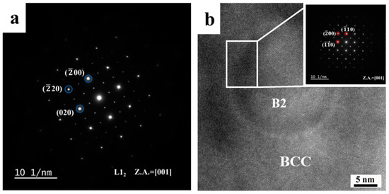 TEM images of Al1.1CoCrFeNi2.1: (a) SAED corresponding to the L12; (b) HRTEM image of BCC (B2).