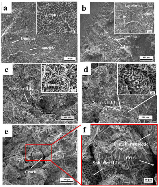 Fracture morphologies of (a) −100-alloy; (b) RT-alloy; (c) 650-alloy; (d) 750-alloy; (e) 850-alloy; (f) magnified spherical L12 and lamellar eutectic of 850-alloy.