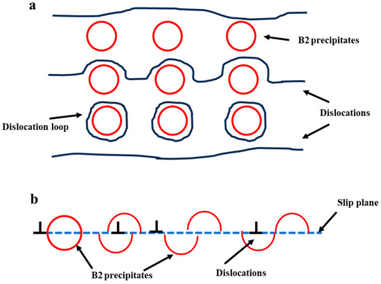 The precipitates inhibit the dislocation motion and result in a strengthening effect. Figure 4b shows that the B2 precipitate phase observed during the deformation process can effectively pin the dislocations through a process known as the Orowan bypass mechanism. When the dislocations approach the precipitates, they start to curve around the non-deformable particles. Under sufficiently applied stress, dislocations may move across the precipitates, leaving behind Orowan loops around the particles (Figure 10a). Dislocation movement can be impeded by the B2 precipitates, thereby improving the strength for the −100-alloy and RT-alloy.