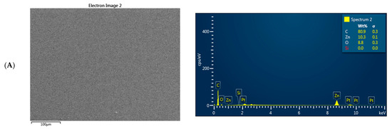 As the uniformity of the different coatings is a key element in their protective ability, the coated Zn samples were investigated via SEM and EDS. The SEM images of the samples (Figure 6) proved that by modifying the SiO2 nanoparticles within the epoxy resin, we achieved a more uniform coating, eliminating the chance of aggregations. The repartition of the SiO2 NPs inside the epoxy matrix was more uniform in the particular case when they were modified with APTES using method II (Figure 7).
