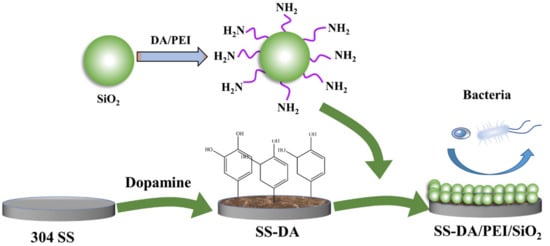 304 SS surface was polished with sandpaper (400, 800, 1000, and 1200#) until it was smooth and clean. The polished samples were then immersed into acetone solution and ethanol solution in successive 10-minute intervals and cleaned with deionized water by ultrasound for 10 min. Subsequently, the treated and dried stainless steel sample was immersed in a 2 mg/mL dopamine (dissolved in Tris-HCl buffer, pH = 8.5) solution at 37 °C for 12 h to activate the sample’s surface. Silica dioxide (SiO2) particles weighing 1.0 g were immersed in a 50 mL Tris-HCl solution with a pH of 8.5. The suspension was then subjected to 10 min of sonication to achieve a uniform dispersion of the silica particles. Subsequently, a mixture of dopamine and polyethyleneimine (PEI) in a 1:1 mass ratio was introduced into the silica suspension, with a final concentration of 2 mg/mL. The mixed DA/PEI/SiO2 solution was obtained after the reaction under 25 °C for 12 h, and then the dopamine-treated surfaces (SS-DA) were immersed in DA/PEI/SiO2 solution under 25 °C for 24 h to prepare the surface modified with dopamine, PEI, and SiO2, which denoted as SS-DA/PEI/SiO2 (Figure 1). In order to compare the effect of dopamine addition sequence on the grafting amount of SS-DA/PEI/SiO2, a mixture solution of PEI/SiO2 was used to modify dopamine-treated SS directly, and the sample was named SS-DA-PEI/SiO2.