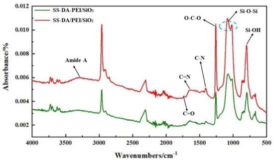The successful fabrication of silica nanocomposite coatings was unequivocally established by assessing the surface functional groups of SS-DA/PEI/SiO2 and SS-DA-PEI/SiO2 samples through Fourier transform infrared spectrometry (FTIR). The FTIR analysis revealed distinctive peaks: the bands at 2970–3015 cm−1 were ascribed to the C–H stretching of CH3 and CH2, while the peak near 800 cm−1 was attributed to Si-OH stretching vibrations and the two peaks (blue circle) around 1100 cm−1 was contributed to Si-O-Si symmetric stretching vibrations, as depicted in Figure 2 [19]. Furthermore, the peak between 2300 cm−1 and 2400 cm−1 corresponded to O=C=O vibrations, and the peak at approximately 1660 cm−1 was associated with the C=N bond of polyethyleneimine (PEI) and dopamine (DA). Additional peaks near 1410 and 1566 cm−1 were attributed to C-N and N-H vibrations [20], whereas the broad peaks spanning from 3200 to 3500 cm−1 were attributed to -OH stretching vibrations [9]. The broader peaks ranging from 3500 to 3750 cm−1 were a consequence of -OH stretching vibrations arising from the oxidative polymerization of the nanosilica surface and dopamine, resulting in the formation of hydroxyl groups within polydopamine. The peak observed at 1750 cm−1 was a manifestation of the C=O stretching vibrations of polydopamine and its intermediate products [21]. Collectively, these analyses serve as conclusive evidence confirming the successful modification of SS with DA/PEI/SiO2. The presence of Si-containing functional groups on the surface of SS-DA/PEI/SiO2 and the significantly higher peaks of SS-DA/PEI/SiO2 compared to SS-DA-PEI/SiO2 indicated that dopamine modification followed by DA/PEI/SiO2 modification would lead to more silica binding to the surface.