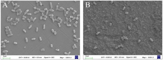 The SEM adhesion images of V. natriegens on surfaces of SS (A) and SS-DA/PEI/SiO2 (B).