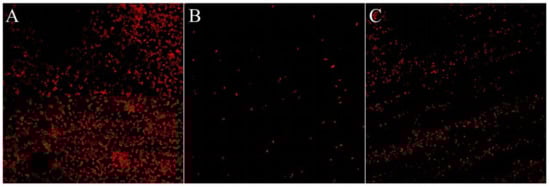Confocal Laser Scanning Microscopy images depicting the attachment of Vibrio natriegens to the surfaces. (A): SS; (B): SS-DA/PEI/SiO2 (1 day); (C): SS-DA/PEI/SiO2 (7 days).