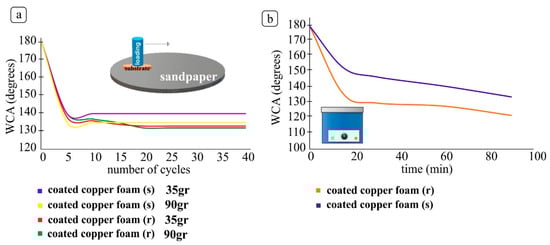 - The modified copper foams exhibited significant chemical and thermal stability. Specifically, WCA of the foam with the smooth substrate consistently stays high at approximately 140° even after 40 h of exposure at both temperatures (100 °C and −15 °C). In contrast, after the same time duration, the contact angle of the foam having a rough substrate decreases to 120° at 100 °C and 110° at −15 °C. A stable contact angle is consistently observed in both acidic and alkaline environments for both types of foams. However, contact angles for the samples with the smooth substrate have greater values. All the foams retain their hydrophobic characteristics, even following a 40 h immersion.