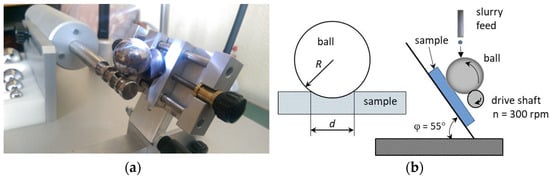 The wear scars were produced with test times of 10 s, 20 s, 30, 40 s, 50 s, and 60 s to obtain the volume loss curve. The number of parameters affect the results of the free rotating ball cratering tests. The most significant of them are [38]: the abrasive material, the abrasive size and shape, the abrasive slurry loading, the type of suspension fluid, the drive shaft rotation speed, the ball mass, its diameter, material, and surface roughness. All these parameters were kept approximately the same during all tests. Assuming that the crater is spherical in shape and that its depth and diameter are significantly smaller than the diameter of the ball, the volume loss of a monolithic material (V) removed from the crater and its depth (h) can be calculated according to the following equations [30,39]:
