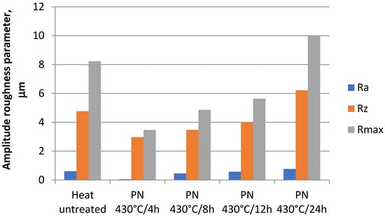 The all-surface roughness amplitude parameters were decreased after PN (except for PN process lasting 24 h) compared to the untreated state, because of the sputtering process applied before plasma nitriding treatment. With prolongation of nitriding time at 4–12 h, all surface roughness parameters were increased due to the formation of the nitrogen-supersaturated S-phase and Fe and Cr nitrides in the surface layer.