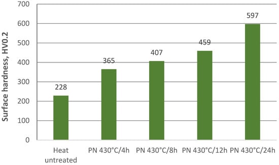 The effective depth of nitriding, determined as the distance from the surface where the measured hardness is greater than the hardness of the core by 50 HV0.05, is 6–8 μm for the sample nitrided for 8 h, 10–12 μm for the sample nitrided for 12 h, and 18–20 μm for the sample nitrided for 24 h. From the distribution of hardness by layer depth, an increase in nitriding depth and surface hardness can be observed with longer nitriding time.