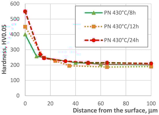 Distribution of hardness according to the depth of the nitrided AS steel AISI 316L after plasma nitriding at 430 °C with a process duration of 8 h, 12 h, and 24 h.