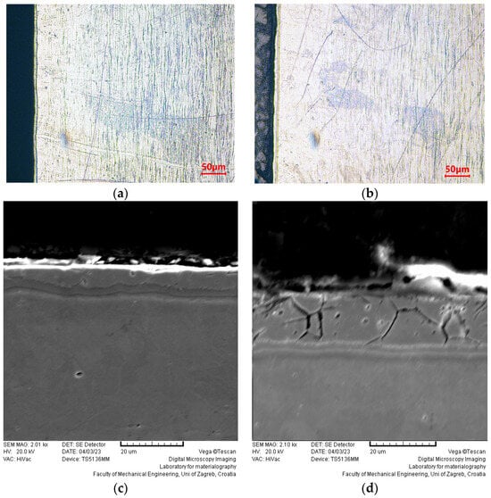 Figure 6 shows the microstructure of the nitrided layer on an AISI 316L steel after nitriding at 430 °C for 4 h and 8 h observed with light microscopy (LM) on a Metallurgical microscope KERN OKO 178 (KERN & SOHN GmbH, Balingen, Germany), and after 12 h and 24 h observed with the scanning electron microscopy (SEM) on a device Tescan Vega 5136LS. The LM measured thickness of a nitride layer after PN treatment for 4 h and 8 h was 3–4 μm and 6–9 μm, respectively. A nitride layer achieved after PN treatment for the duration of 12 h has a thickness between 11 and 14 μm and, as can be observed in Figure 6c, it consists of the expanded austenite with a very thin top layer of brittle nitrides. In the expanded austenite sub layer, grains were of equal size and similar shape, without visible nitride precipitates. Figure 6d shows a significantly thicker nitride layer, compared with the previously described one, with precipitates of iron and chromium nitrides on the grain boundaries. The thickness of this layer, which was formed after 24 h of plasma nitriding, had values between 16 and 20 μm. The results of the SEM analysis of the nitrided layer coincide with the results of the microhardness test.