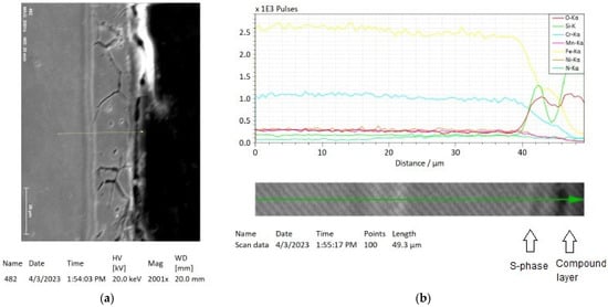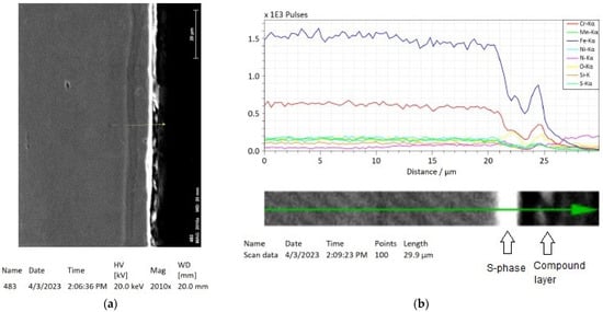 The elemental composition of the nitrided layers on an AISI 316L steel was determined via line EDS analysis with device Bruker. The distribution of elements in the surface layer after nitriding at 430 °C/12 h is shown in Figure 7. The formation of iron and chromium nitrides is confirmed by the increased presence of elements iron (Fe), chromium (Cr), and nitrogen (N) in the compound layer. Below, there is a thin layer of the expanded austenite (S-phase) with decreased content of Fe and Cr. Above the S-phase toward to the surface, an increased presence of Fe, Cr, and N can be observed at distances from 22 to 25 μm in Figure 7. This is caused by formation of compound layer formed from metal elements (Fe, Cr) diffused from steel core and nitrogen (N) diffused from the ionized H2-N2 plasma.
