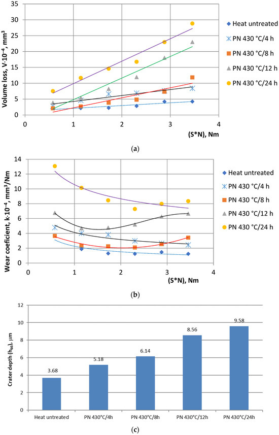Results of micro-abrasive wear of a nitrided AS steel AISI 316L: (a) loss of volume from the calotte crater against SN product; (b) wear coefficient κ; (c) crater depth after 60 s wear.