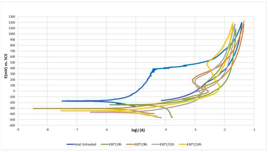 In the initial phase of the polarization measurement, the system was stabilized in such a way that after immersion in in 3.5 wt. % NaCl water solution at room temperature (20 ± 2) °C, the electrical circuit between the working and counter electrodes was left open, and the potential difference between the reference and working electrodes was recorded as a function of time [43,44]. The measured numerical values of open circuit potentials for heat-untreated and nitrided AS steel AISI 316L samples (4 h, 8 h, 12 h and 24 h) were recorded after stabilization in 3.5 wt. % NaCl water solution at room temperature (20 ± 2) °C and are shown in Table 5. Graphical values of corrosion potentials are given in Figure 10.